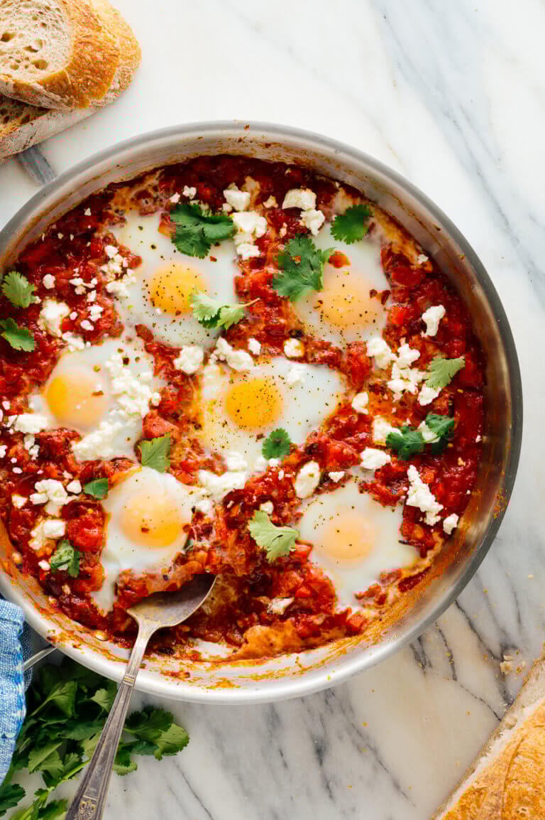 - Using oven mitts (both hands!), transfer the hot skillet to a heat-safe surface like the stove. Top with the crumbled feta, fresh cilantro leaves, and more red pepper flakes, if desired. Serve in bowls with crusty bread on the side.