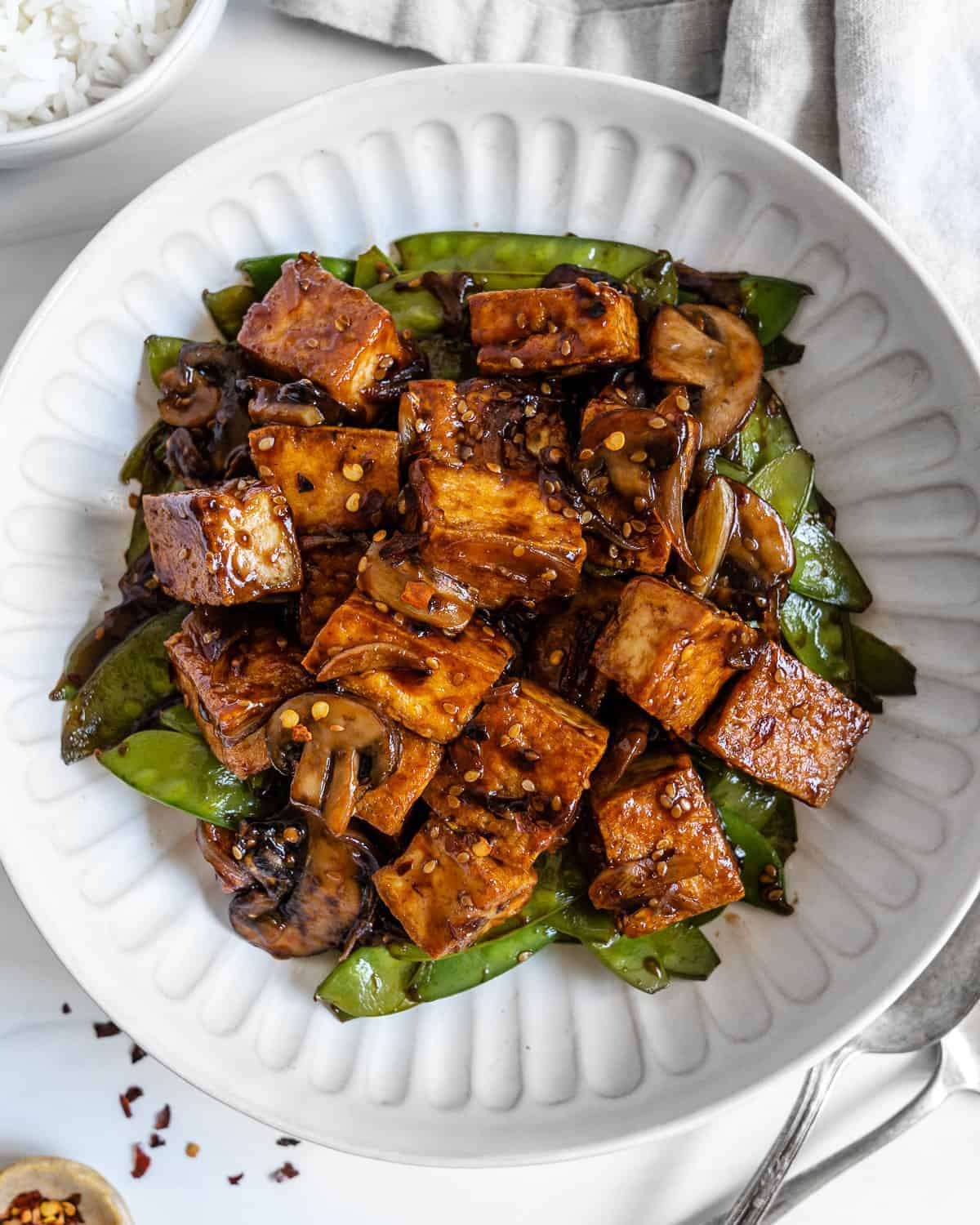 - Add the tofu and sauce mixture and cook until the sauce begins to thicken, about a minute.